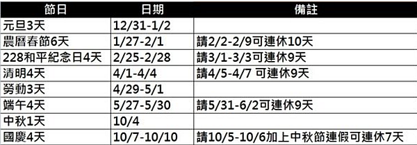 另外再連續假期的部分也用休閒的鵝黃色框起來,很明顯的可以看出明年1月是個好日子無誤