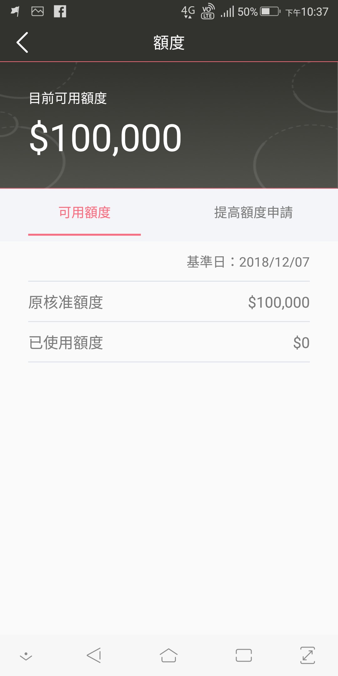 待開通後,即可於APP中查詢額度,尼克的條件系統給發的額度為10萬
