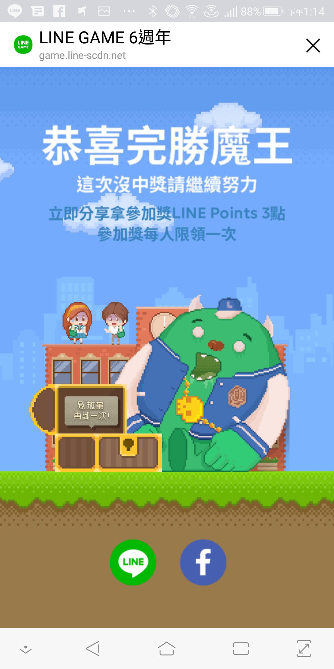 參加獎 (已被領完)LINE Points 3 點 x 100,000名(前10萬名參加並完成分享者可獲得),此獎項已被領光- 完勝魔王獎