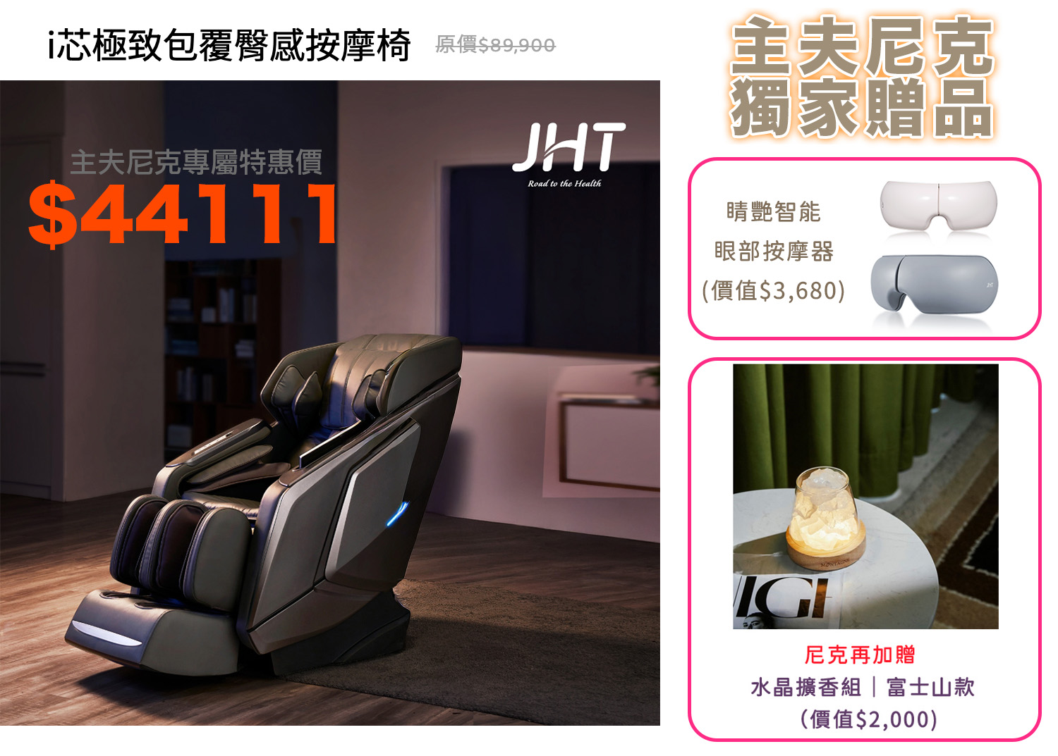 跟尼克獨家方案: 跟主夫尼克團入手「 JHT i芯極致包覆臀感按摩椅」✨再加碼送超好 K-1516眼部按摩器