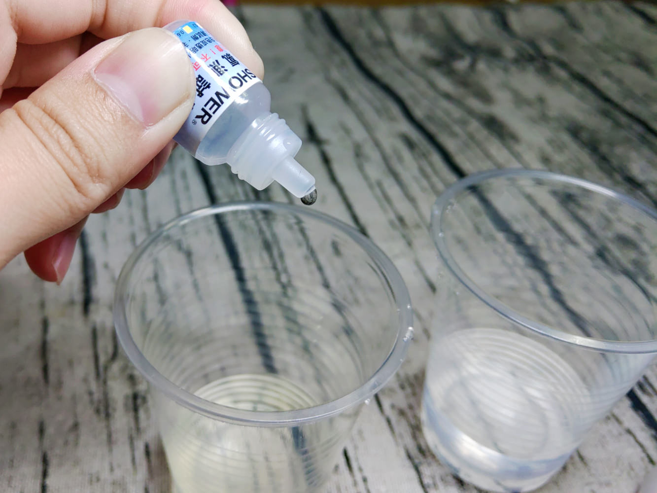 而右邊過濾後的水,則是沒有特別的顏色變化