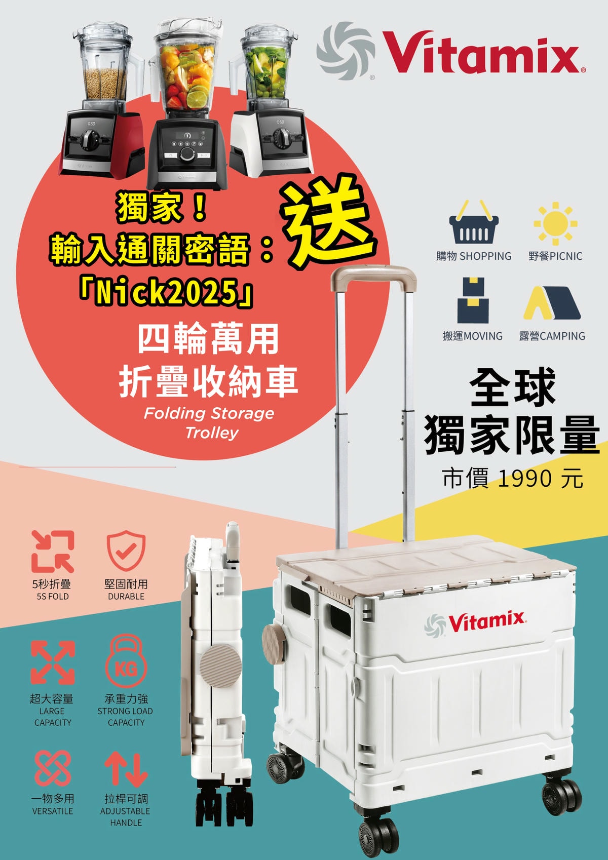 - 尼克團獨家!加碼贈送 Vitamix 四輪萬用折疊收納車(市價1990元)